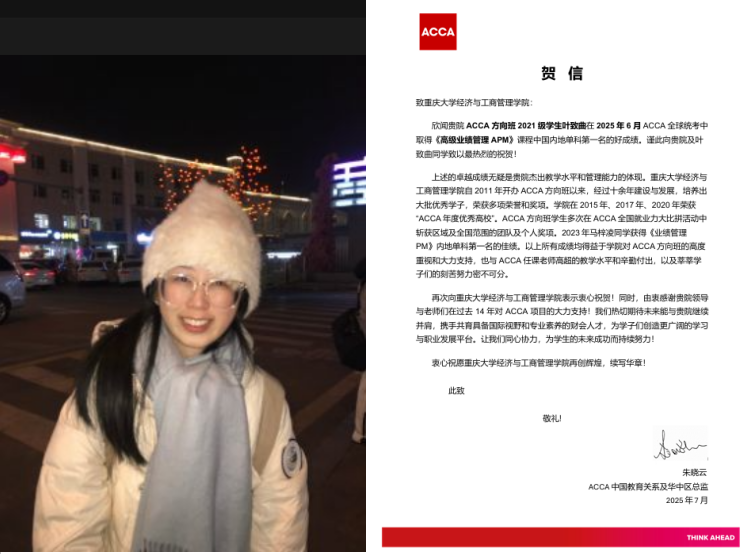 英国特许会计师公会(简称“ACCA”)公布2025年6月考季全球统考成绩,经济与工商管理学院2022级会计学(ACCA方向)叶致曲同学在此次全球统考中获得《高级绩效管理(APM)》课程中国内地单科第一的好成绩。APM课程属于ACCA战略专业阶段的核心课程之一,难度较高。在2025年6月考季中,该科目的全球通过率仅为40%。ACCA在全球范围内享有高度的认可度。重庆大学经济与工商管理学院自2011年开办ACCA方向班以来,经过十余年建设与发展...