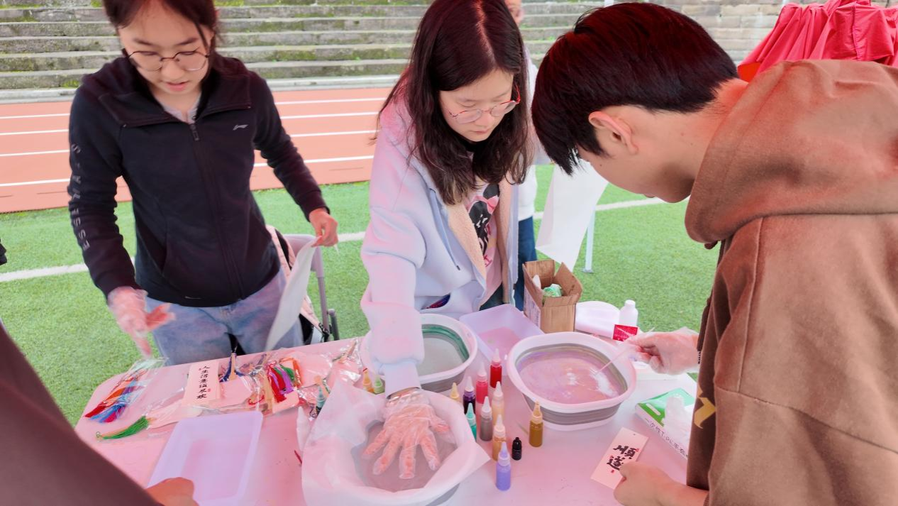在“布艺扎染·寅初印迹”展位,同学们手持白坯方巾与漆扇,在负责人的指导下折叠、捆扎、浸染。当蓝白相间的纹样在布料上晕染开,每一次扎结的松紧、每一次浸染的时长,都如学术研究般需严谨琢磨,同学们在靛蓝染料的沉淀中,读懂了“耐劳苦,尚俭朴”的校训底色。