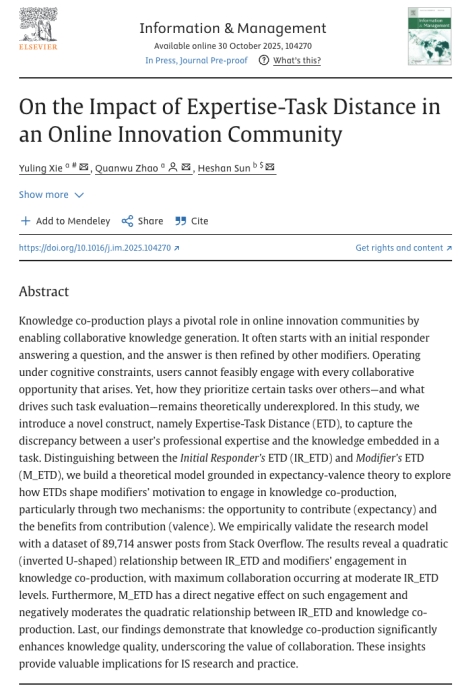 该研究以在线创新社区Stack Overflow为背景,探讨了用户在知识协作生产过程中的任务选择与协作机制。在大量知识协作机会并存的环境中,用户如何在认知约束下评估任务、选择任务,并形成高质量的知识共创,仍是学界长期关注而尚未充分揭示的科学问题。面向这一议题,研究揭示了用户在知识协作生产过程中的任务选择逻辑与协作机制,回应了“个体-任务匹配”视角下知识共创行为的理论空白。研究提出并界定了一个全新的理论构念—“知识距离”(Expertise–Task Distance,ETD),用于衡量个体专业知识与任务知识之间的差距。研究进一步区分了初始回答者的ETD(IR_ETD)与合作者的ETD(M_ETD),并基于期望—效价理论构建理论模型,揭示了不同类型ETD如何通过影响合作者对任务可行性与预期收益的判断,从而塑造其参与知识共创的动机与行为。基于Stack Overflow平台的89,714条回答数据的大规模实证分析发现:初始回答者的ETD与合作者参与知识共创的程度之间呈倒U型关系,即当初始回答者的专业知识与任务距离适中时,最能激发他人参与合作;合作者自身的ETD对知识共创行为具有显著负向影响,并削弱上述倒U型关系;知识共创显著提升了社区知识质量,验证了协作生产模式在知识创新中的核心作用。该研究创新性地提出了“知识距离”这一新构念,从“用户-任务”匹配的视角拓展了以往以“用户—用户”关系为中心的知识协作研究,为理解在线创新社区中的知识共创机制提供了新的理论框架与实证证据。